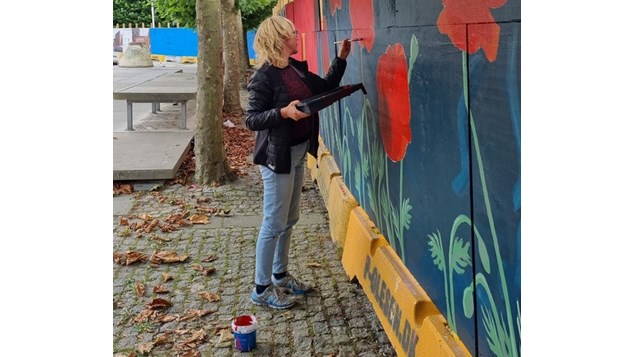 Det har været vigtigt at give plads til en mangfoldig flok kunstnere på byggehegnet mod Rådhustorvet. Nogle har rødder i graffitien, andre arbejder med illustrationer eller mere klassisk maleri. Der er også et særligt samarbejde med en gruppe unge fra Håndværkskollegiet i byen, som med deres mentor, den lokale kunstner Heidi Zilmer, er i gang med at skabe et fælles street art-værk.