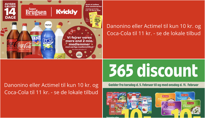 Coop365 tilbyder Danonino eller Actimel til en skarp pris af kun 10 kr. pr. stk. Vægten varierer mellem 300-400 g, og kg-prisen er maks. 33,33 kr. Tilbuddet er gyldigt fra torsdag den 5. februar til onsdag den 11. februar.