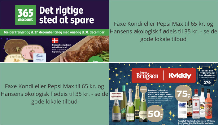Coop365 tilbyder Faxe Kondi eller Pepsi Max i en stor pakke med 24 x 33 cl til kun 65 kr. Du kan vælge frit mellem varianterne. Tilbuddet gælder fra lørdag den 27. december til onsdag den 31. december. Husk, der er en begrænsning på maks. 6 pakker pr. kunde.
